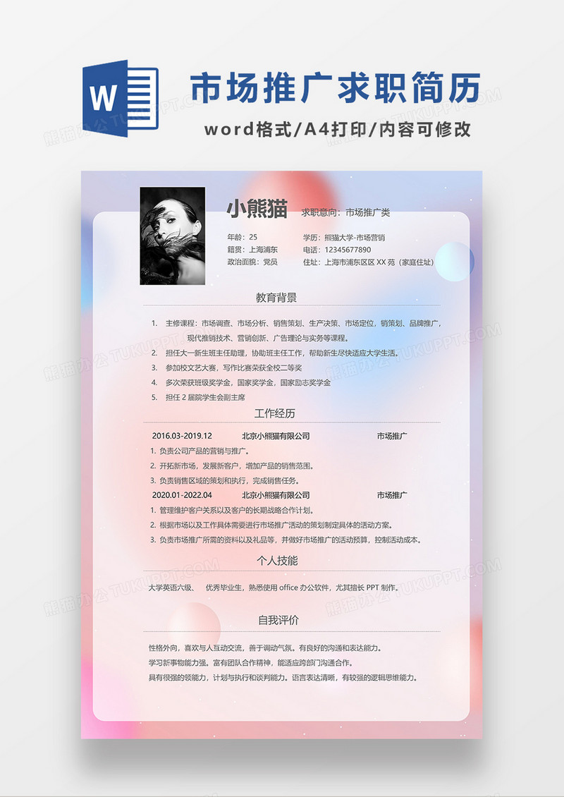 本作品为渐变背景风市场推广类求职简历WORD模板, 编号:510jr4w6va, 格式为 docx, 大小1 MB, 本作品下载后,先解压,解压之后用推荐软件 Word(2019) 打开, 然后进行编辑功能。