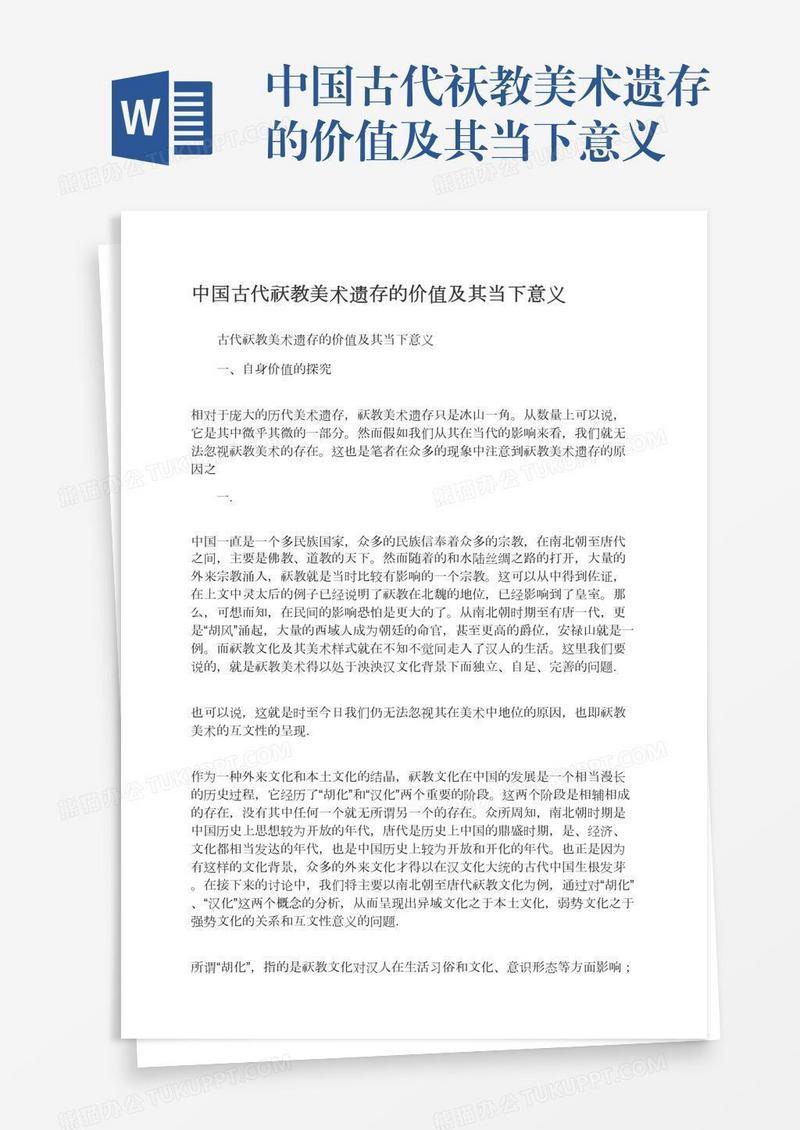 本作品为中国古代祆教美术遗存的价值及其当下意义, 编号:510jrj6nra, 格式为 docx, 大小1 MB, 本作品下载后,先解压,解压之后用推荐软件 Word(2010) 打开, 然后进行编辑功能。