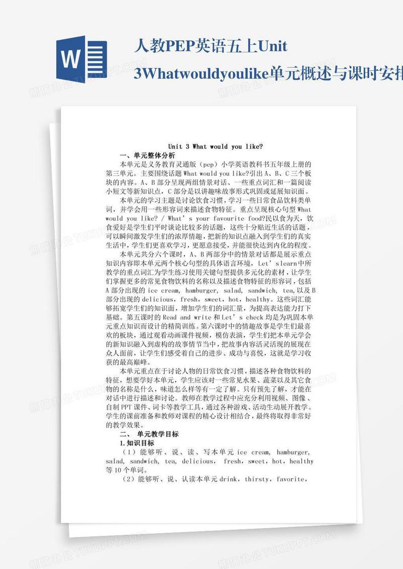 本作品为人教PEP英语五上Unit3Whatwouldyoulike单元概述与课时安排, 编号:510jrn837a, 格式为 docx, 大小1 MB, 本作品下载后,先解压,解压之后用推荐软件 Word(2010) 打开, 然后进行编辑功能。
