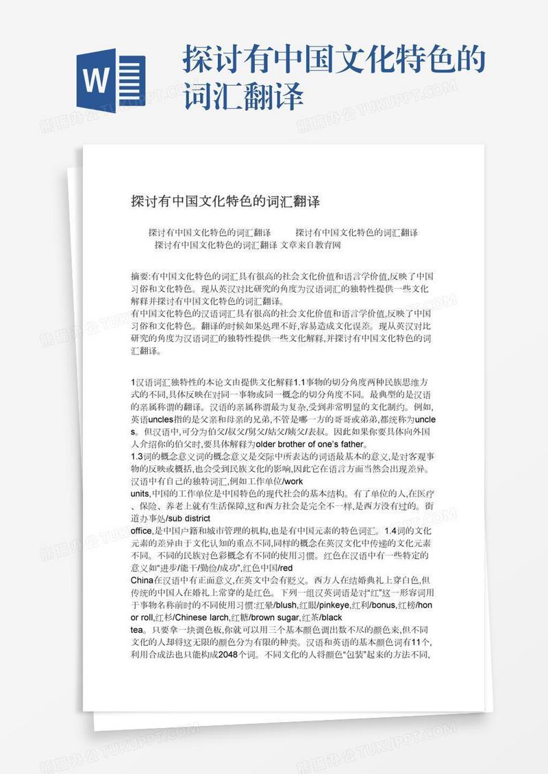 本作品为探讨有中国文化特色的词汇翻译, 编号:510jrok28a, 格式为 docx, 大小1 MB, 本作品下载后,先解压,解压之后用推荐软件 Word(2010) 打开, 然后进行编辑功能。