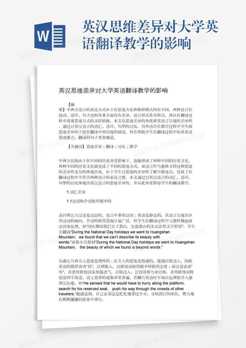 本作品为英汉思维差异对大学英语翻译教学的影响, 编号:5a5255v7da, 格式为 docx, 大小1 MB, 本作品下载后,先解压,解压之后用推荐软件 Word(2010) 打开, 然后进行编辑功能。