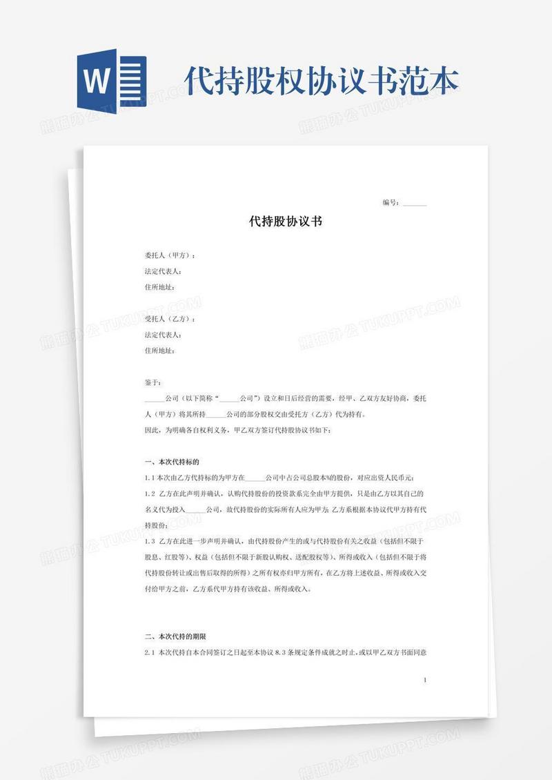 本作品为代持股权协议书范本, 编号:5a525broka, 格式为 docx, 大小1 MB, 本作品下载后,先解压,解压之后用推荐软件 Word(2010) 打开, 然后进行编辑功能。