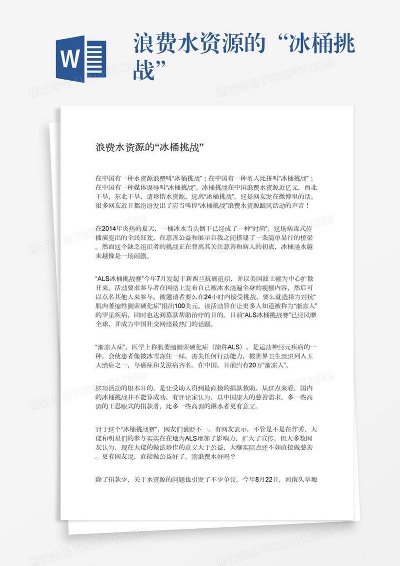 本作品为浪费水资源的“冰桶挑战”, 编号:5a525jd3oa, 格式为 docx, 大小1 MB, 本作品下载后,先解压,解压之后用推荐软件 Word(2010) 打开, 然后进行编辑功能。