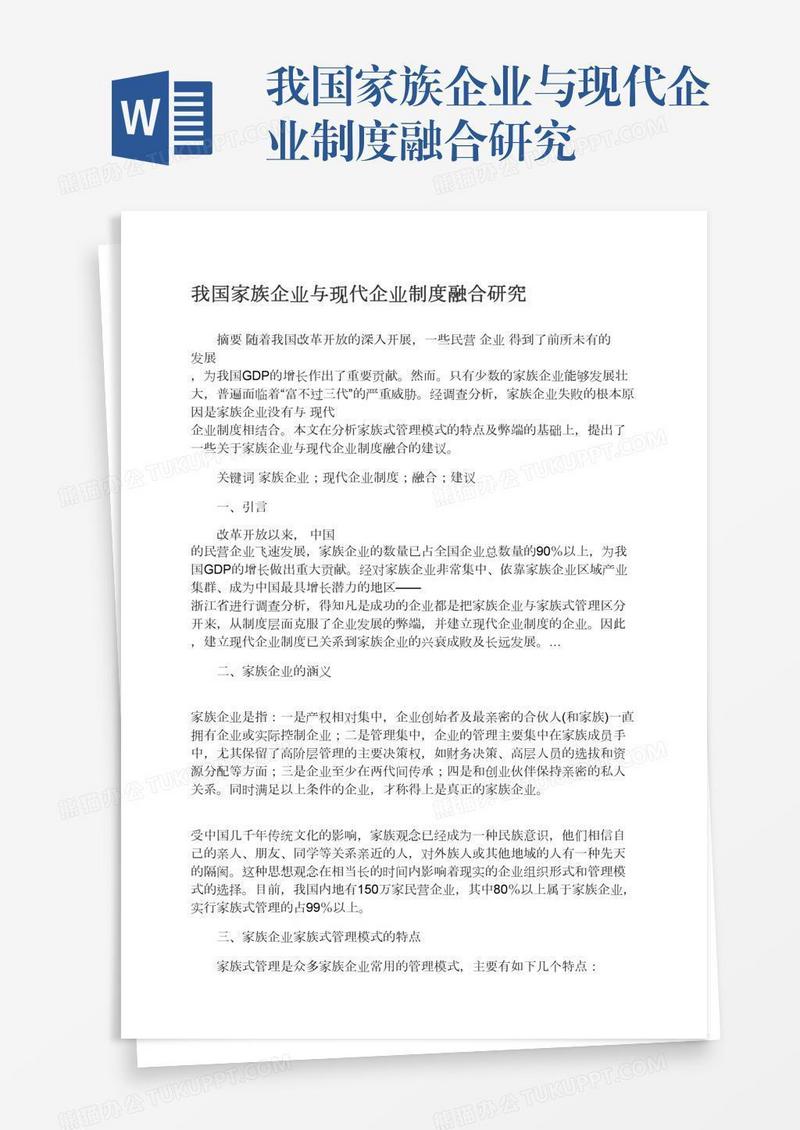 本作品为我国家族企业与现代企业制度融合研究, 编号:5a525o7y6a, 格式为 docx, 大小1 MB, 本作品下载后,先解压,解压之后用推荐软件 Word(2010) 打开, 然后进行编辑功能。