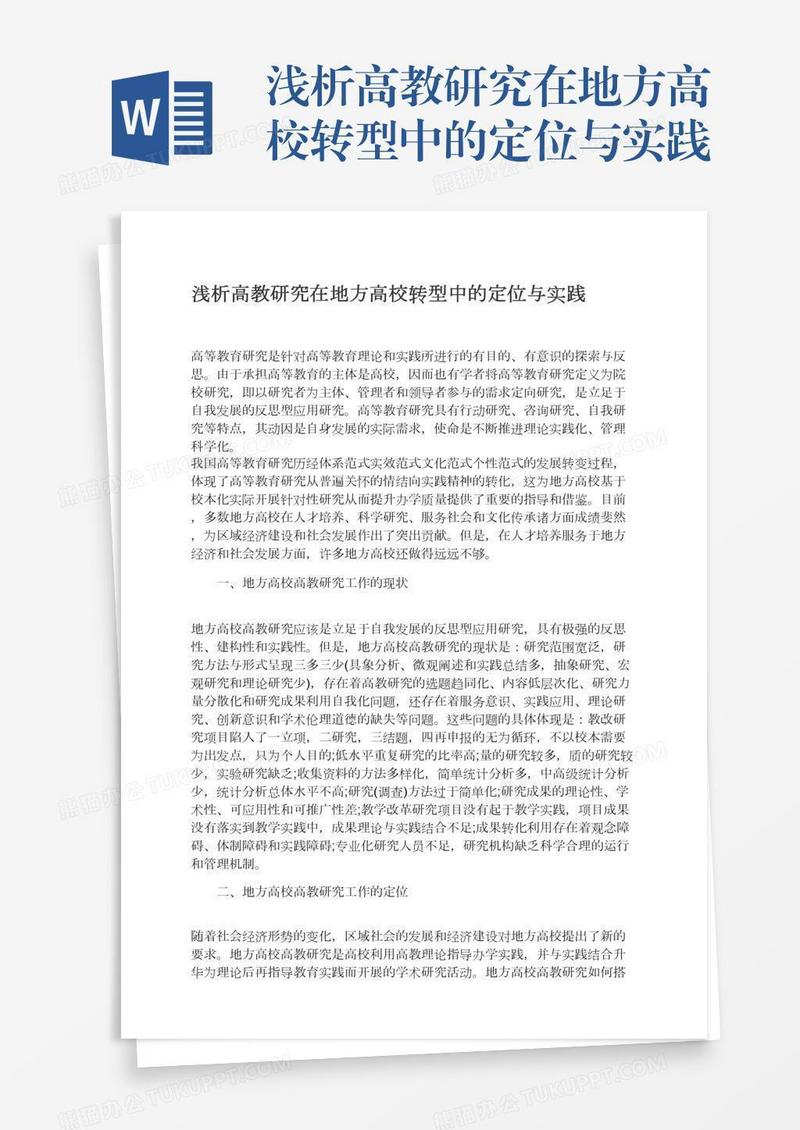 本作品为浅析高教研究在地方高校转型中的定位与实践, 编号:5a525p3o8a, 格式为 docx, 大小1 MB, 本作品下载后,先解压,解压之后用推荐软件 Word(2010) 打开, 然后进行编辑功能。