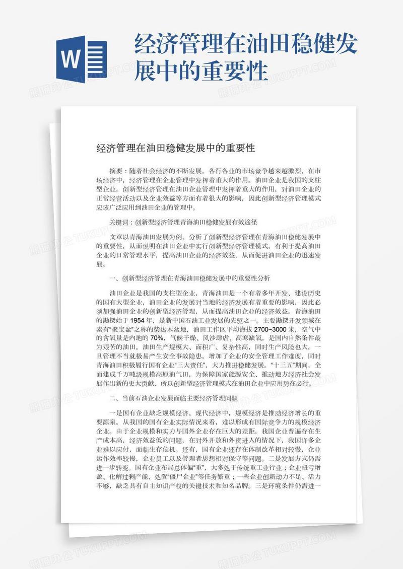 本作品为经济管理在油田稳健发展中的重要性, 编号:5a52o48q8a, 格式为 docx, 大小1 MB, 本作品下载后,先解压,解压之后用推荐软件 Word(2010) 打开, 然后进行编辑功能。
