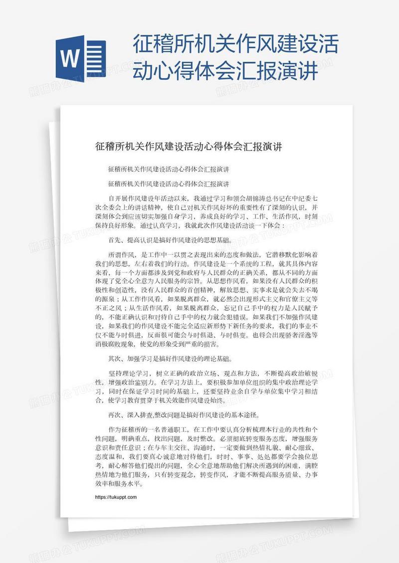 本作品为征稽所机关作风建设活动心得体会汇报演讲, 编号:5a52oeeq6a, 格式为 docx, 大小1 MB, 本作品下载后,先解压,解压之后用推荐软件 Word(2010) 打开, 然后进行编辑功能。