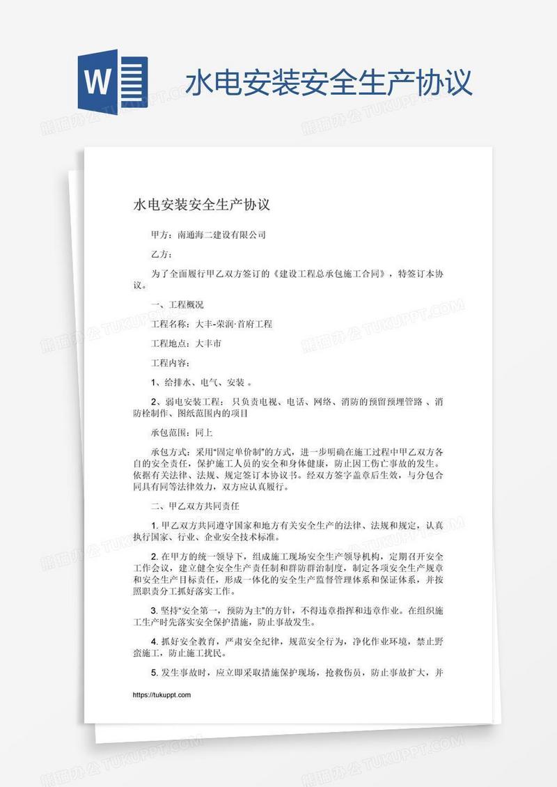 本作品为水电安装安全生产协议, 编号:5a52oj7bja, 格式为 docx, 大小1 MB, 本作品下载后,先解压,解压之后用推荐软件 Word(2010) 打开, 然后进行编辑功能。