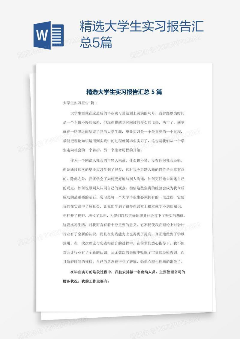 本作品为精选大学生实习报告汇总5篇, 编号:5a52ol07ka, 格式为 docx, 大小1 MB, 本作品下载后,先解压,解压之后用推荐软件 Word(2010) 打开, 然后进行编辑功能。