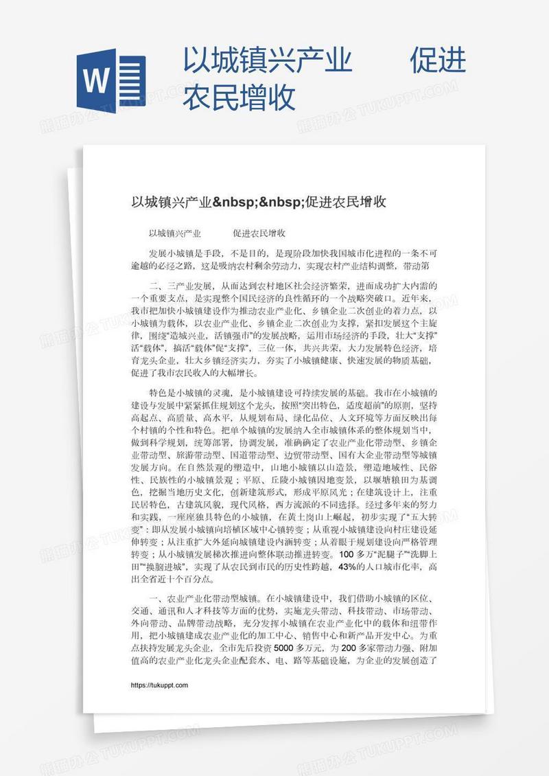本作品为以城镇兴产业 促进农民增收, 编号:5a52olkn8a, 格式为 docx, 大小1 MB, 本作品下载后,先解压,解压之后用推荐软件 Word(2010) 打开, 然后进行编辑功能。