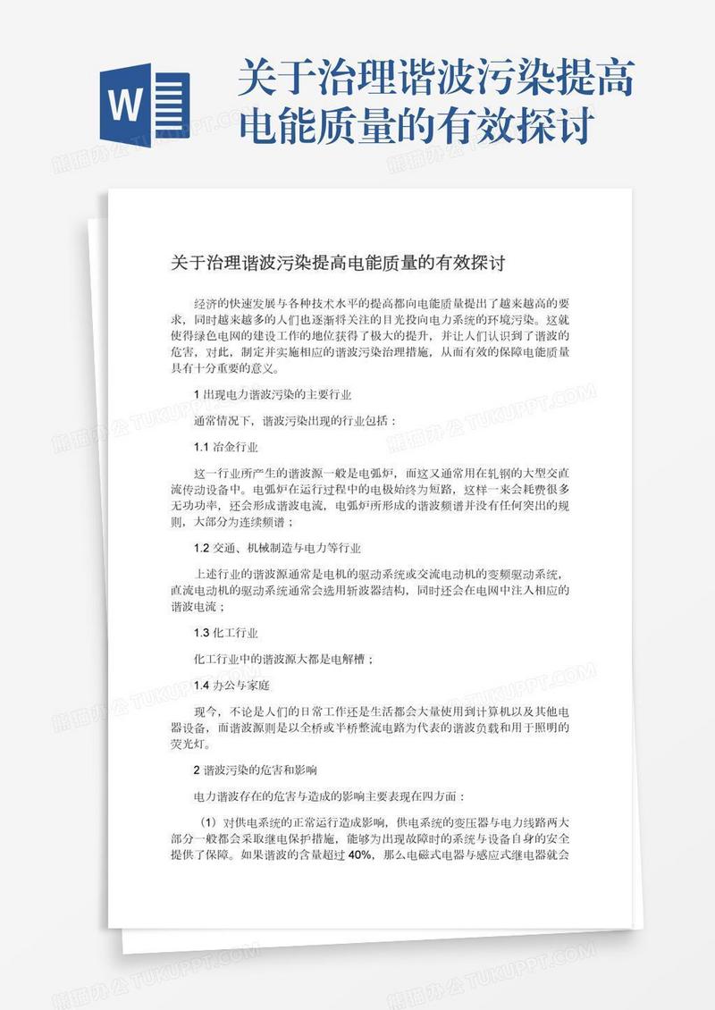 本作品为关于治理谐波污染提高电能质量的有效探讨, 编号:5a52om6eoa, 格式为 docx, 大小1 MB, 本作品下载后,先解压,解压之后用推荐软件 Word(2010) 打开, 然后进行编辑功能。