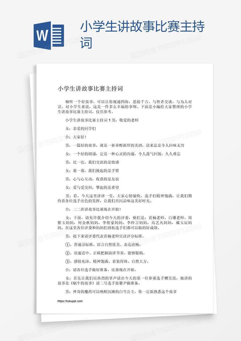 本作品为小学生讲故事比赛主持词, 编号:5a52oolbja, 格式为 docx, 大小1 MB, 本作品下载后,先解压,解压之后用推荐软件 Word(2010) 打开, 然后进行编辑功能。