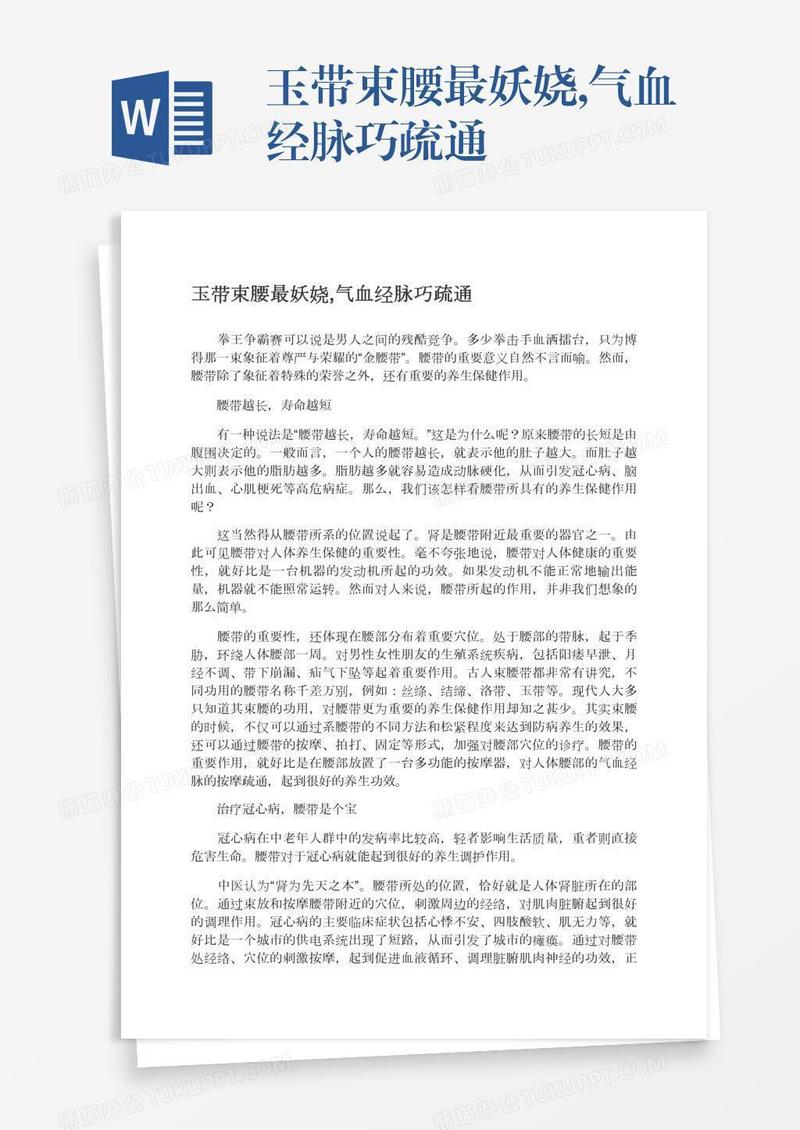 本作品为玉带束腰最妖娆,气血经脉巧疏通, 编号:5a52ov4nka, 格式为 docx, 大小1 MB, 本作品下载后,先解压,解压之后用推荐软件 Word(2010) 打开, 然后进行编辑功能。