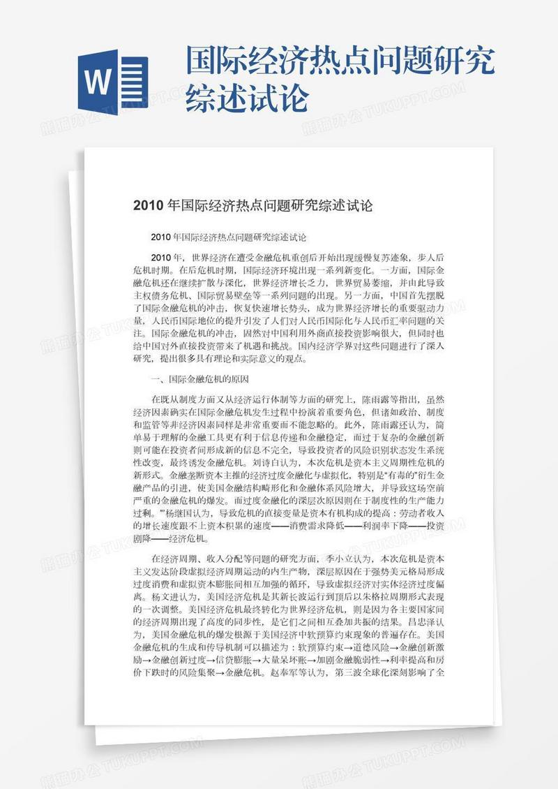 本作品为国际经济热点问题研究综述试论, 编号:5a52ow06da, 格式为 docx, 大小1 MB, 本作品下载后,先解压,解压之后用推荐软件 Word(2010) 打开, 然后进行编辑功能。