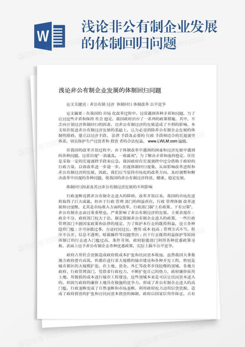 本作品为浅论非公有制企业发展的体制回归问题, 编号:5a52ow2qja, 格式为 docx, 大小1 MB, 本作品下载后,先解压,解压之后用推荐软件 Word(2010) 打开, 然后进行编辑功能。