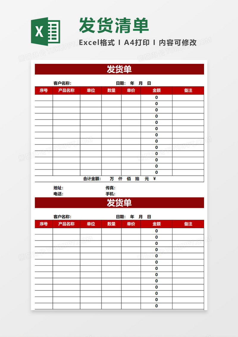 本作品为发货单表格excel红色简洁, 编号:5a52q6mvka, 格式为 xlsx, 大小2 MB, 本作品下载后,先解压,解压之后用推荐软件 Excel(2016) 打开, 然后进行编辑功能。