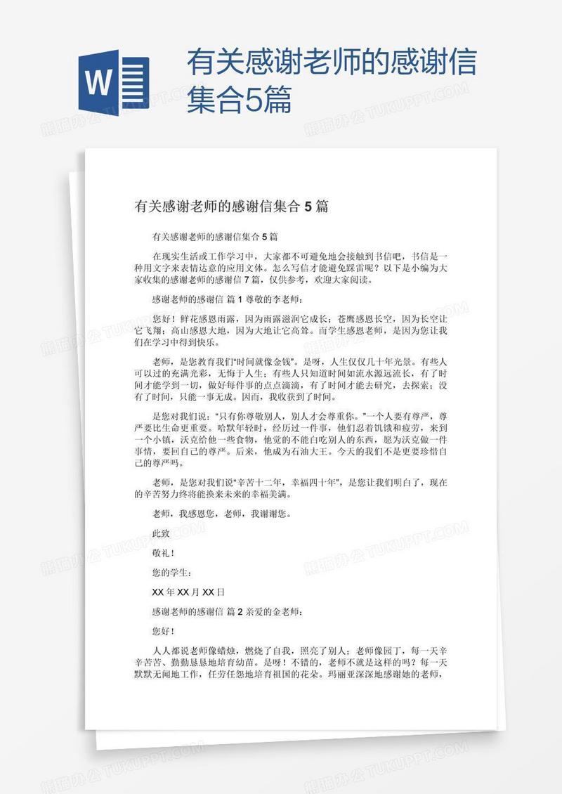 本作品为有关感谢老师的感谢信集合5篇, 编号:5a52qvy8ja, 格式为 docx, 大小1 MB, 本作品下载后,先解压,解压之后用推荐软件 Word(2010) 打开, 然后进行编辑功能。