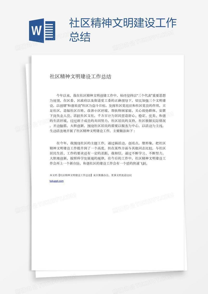 本作品为社区精神文明建设工作总结, 编号:5a52qwk58a, 格式为 docx, 大小1 MB, 本作品下载后,先解压,解压之后用推荐软件 Word(2010) 打开, 然后进行编辑功能。