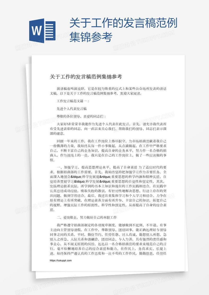 本作品为关于工作的发言稿范例集锦参考, 编号:6187422089, 格式为 docx, 大小1 MB, 本作品下载后,先解压,解压之后用推荐软件 Word(2010) 打开, 然后进行编辑功能。