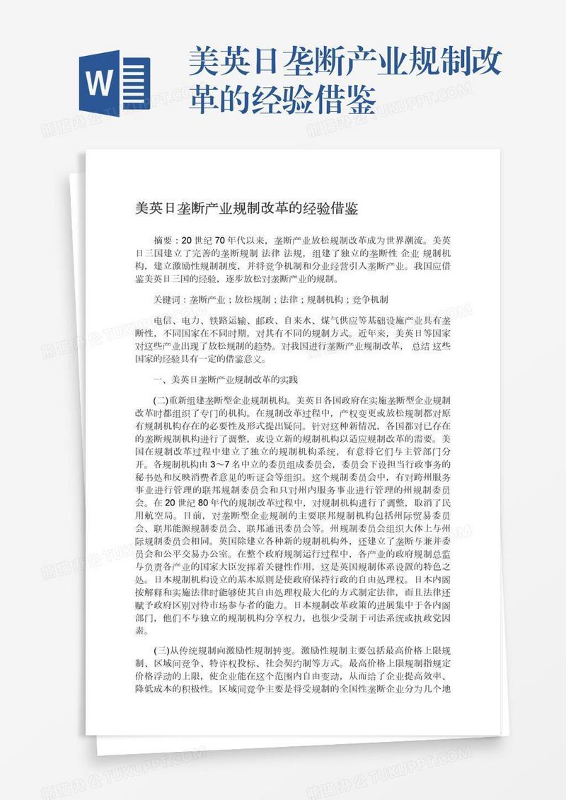 本作品为美英日垄断产业规制改革的经验借鉴, 编号:618745p389, 格式为 docx, 大小1 MB, 本作品下载后,先解压,解压之后用推荐软件 Word(2010) 打开, 然后进行编辑功能。