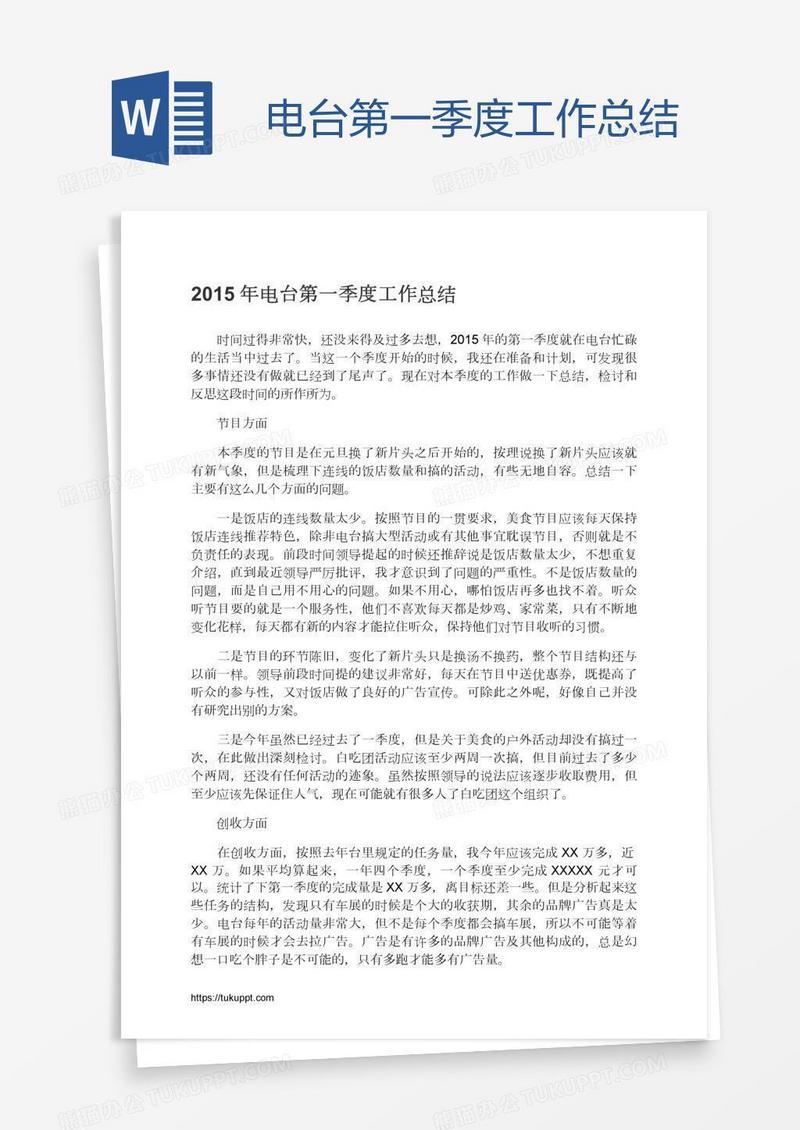 本作品为电台第一季度工作总结, 编号:618746ljj9, 格式为 docx, 大小1 MB, 本作品下载后,先解压,解压之后用推荐软件 Word(2010) 打开, 然后进行编辑功能。