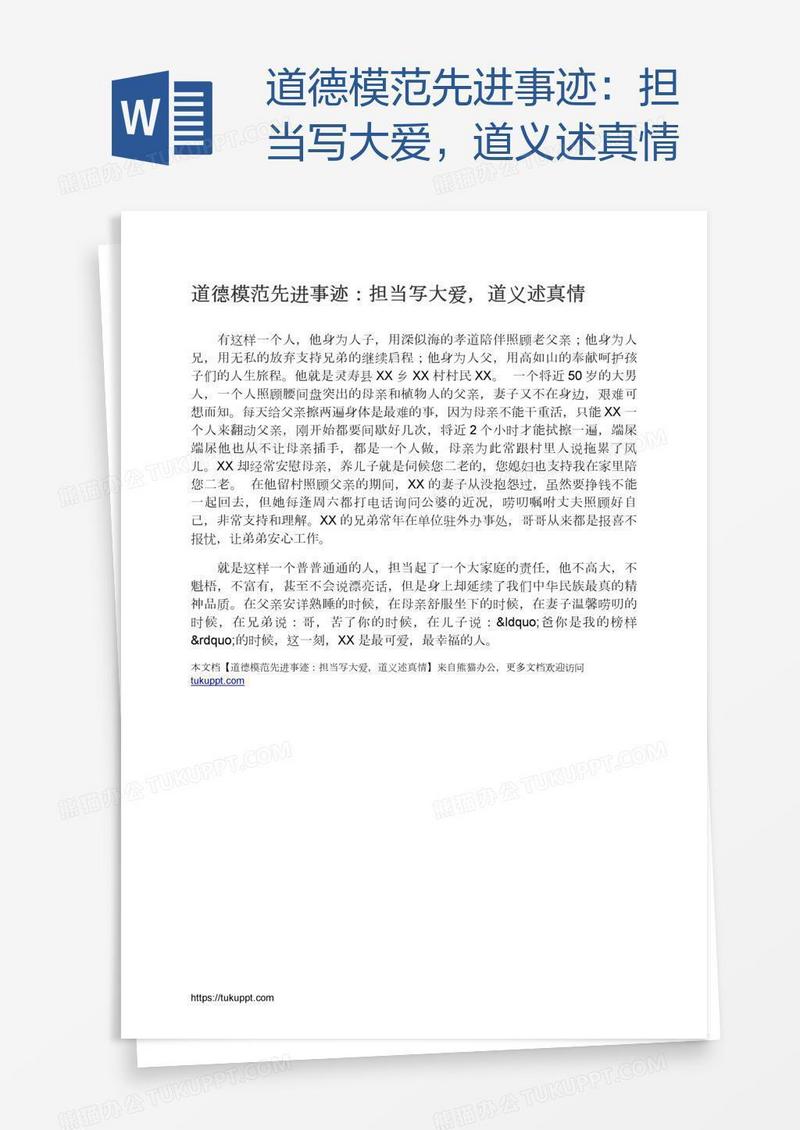 本作品为道德模范先进事迹:担当写大爱,道义述真情, 编号:6187486079, 格式为 docx, 大小1 MB, 本作品下载后,先解压,解压之后用推荐软件 Word(2010) 打开, 然后进行编辑功能。