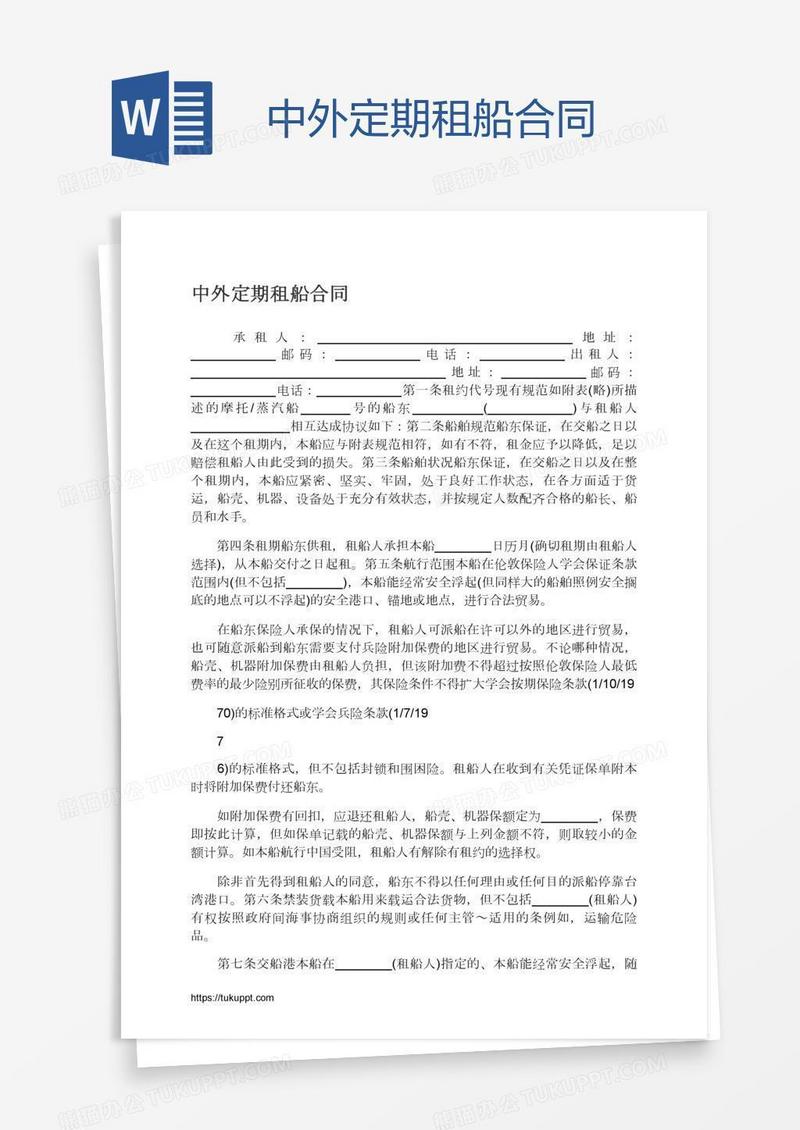 本作品为中外定期租船合同, 编号:61874byk69, 格式为 docx, 大小1 MB, 本作品下载后,先解压,解压之后用推荐软件 Word(2010) 打开, 然后进行编辑功能。