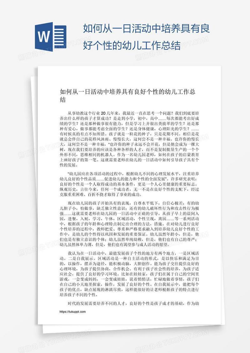 本作品为如何从一日活动中培养具有良好个性的幼儿工作总结, 编号:61874gm759, 格式为 docx, 大小1 MB, 本作品下载后,先解压,解压之后用推荐软件 Word(2010) 打开, 然后进行编辑功能。