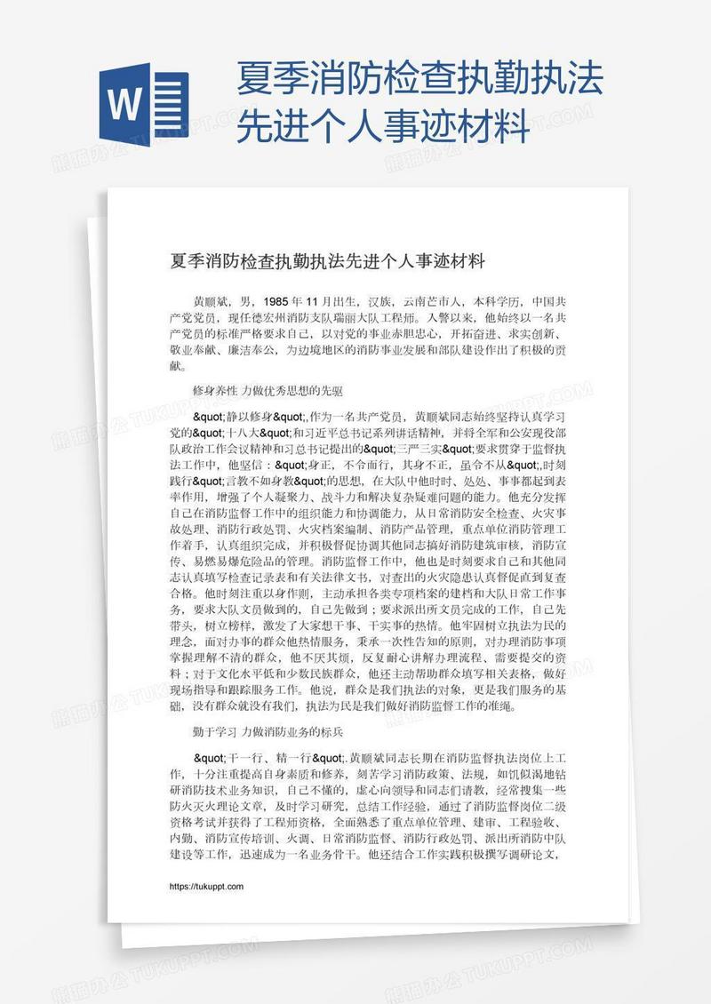 本作品为夏季消防检查执勤执法先进个人事迹材料, 编号:61874jen89, 格式为 docx, 大小1 MB, 本作品下载后,先解压,解压之后用推荐软件 Word(2010) 打开, 然后进行编辑功能。