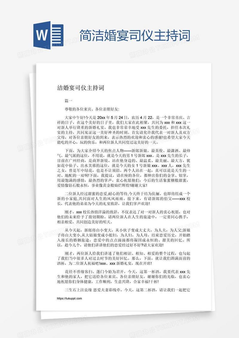 本作品为简洁婚宴司仪主持词, 编号:61874kle89, 格式为 docx, 大小1 MB, 本作品下载后,先解压,解压之后用推荐软件 Word(2010) 打开, 然后进行编辑功能。