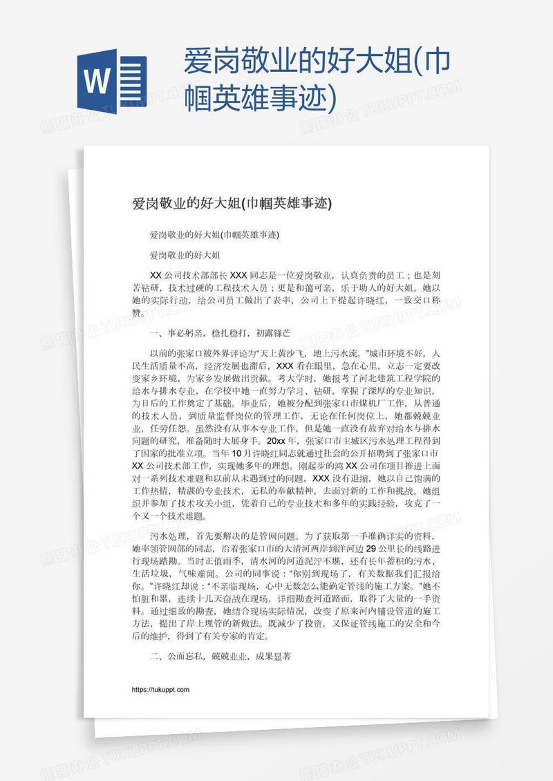 本作品为爱岗敬业的好大姐(巾帼英雄事迹), 编号:61874kr779, 格式为 docx, 大小1 MB, 本作品下载后,先解压,解压之后用推荐软件 Word(2010) 打开, 然后进行编辑功能。