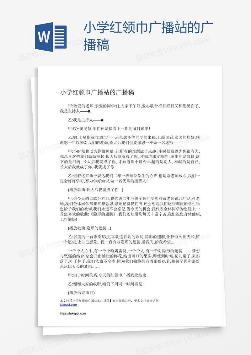 本作品为小学红领巾广播站的广播稿, 编号:61874n4p69, 格式为 docx, 大小1 MB, 本作品下载后,先解压,解压之后用推荐软件 Word(2010) 打开, 然后进行编辑功能。