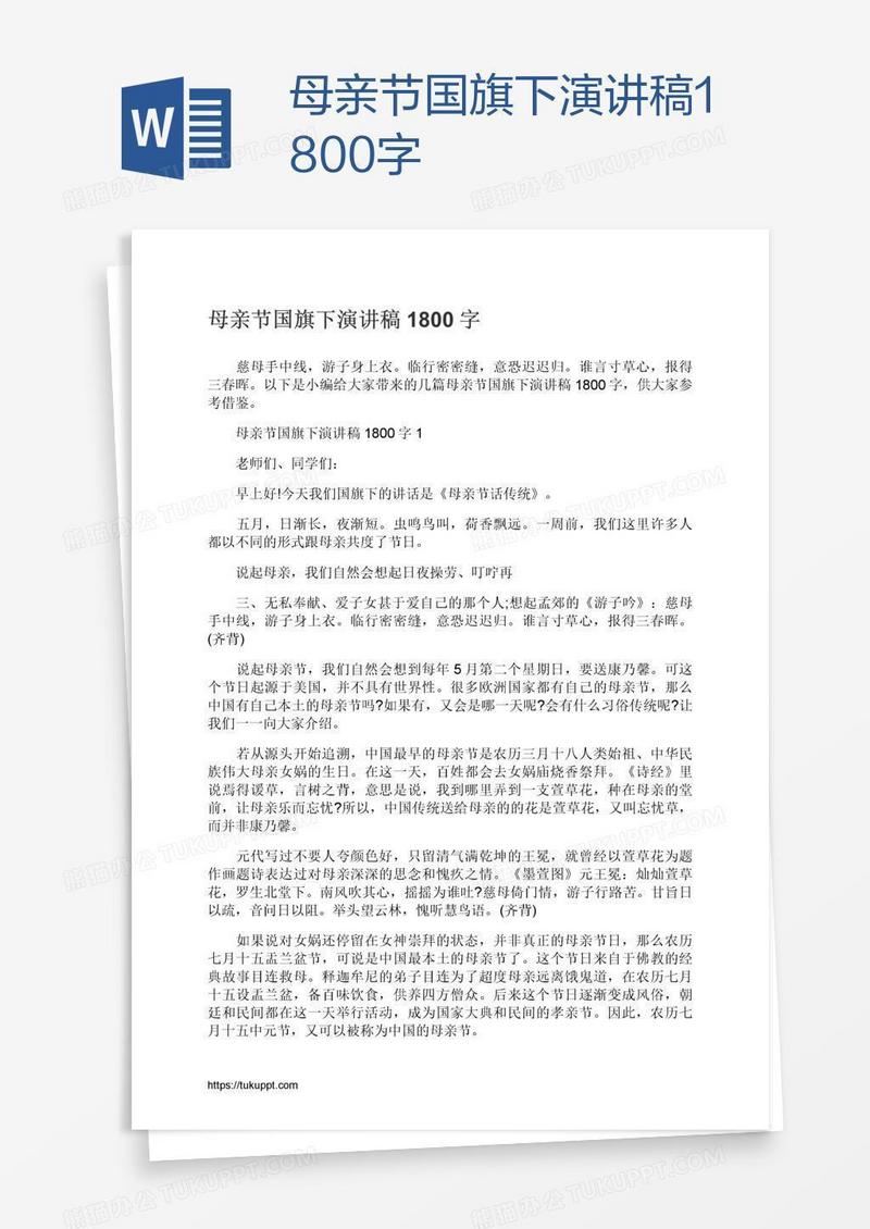 本作品为母亲节国旗下演讲稿1800字, 编号:61874oop59, 格式为 docx, 大小1 MB, 本作品下载后,先解压,解压之后用推荐软件 Word(2010) 打开, 然后进行编辑功能。