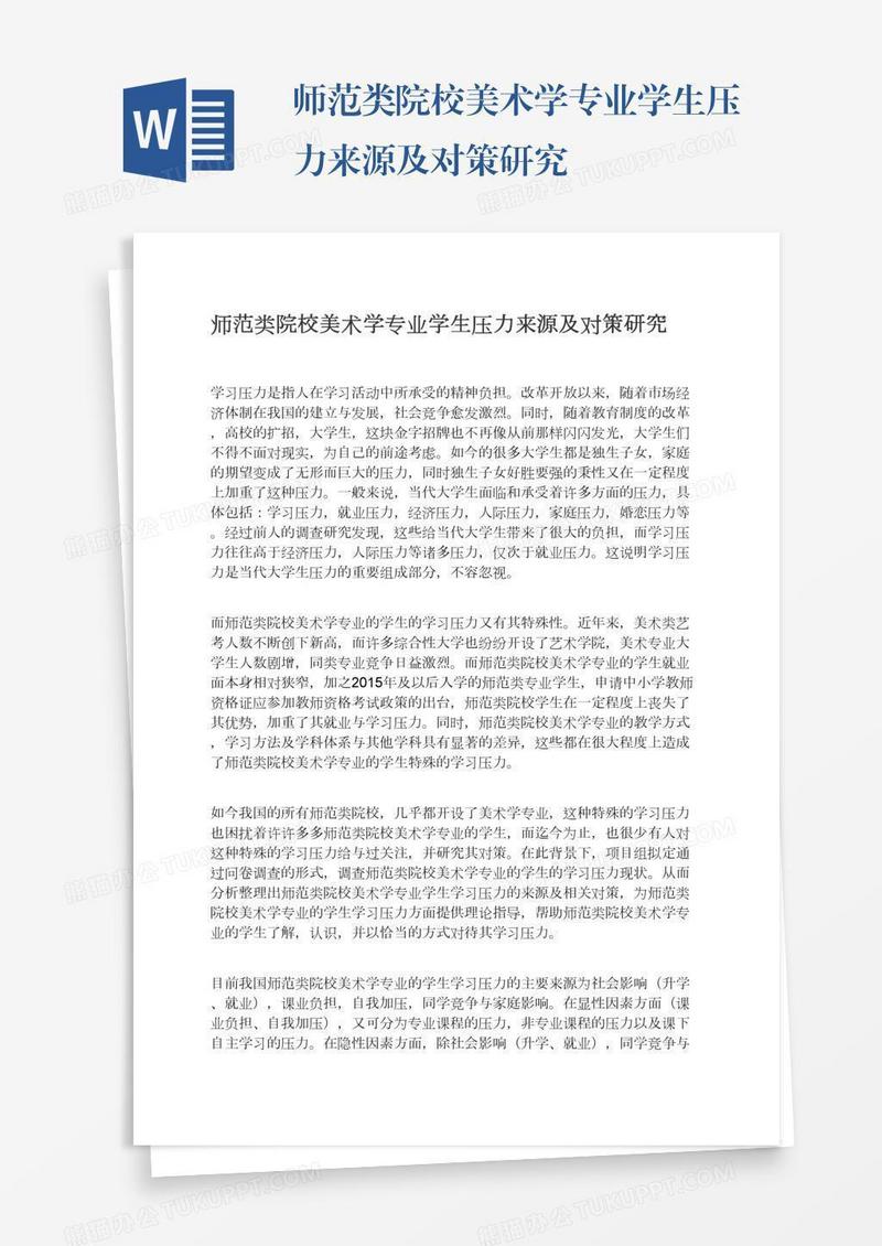 本作品为师范类院校美术学专业学生压力来源及对策研究, 编号:61874p0379, 格式为 docx, 大小1 MB, 本作品下载后,先解压,解压之后用推荐软件 Word(2010) 打开, 然后进行编辑功能。