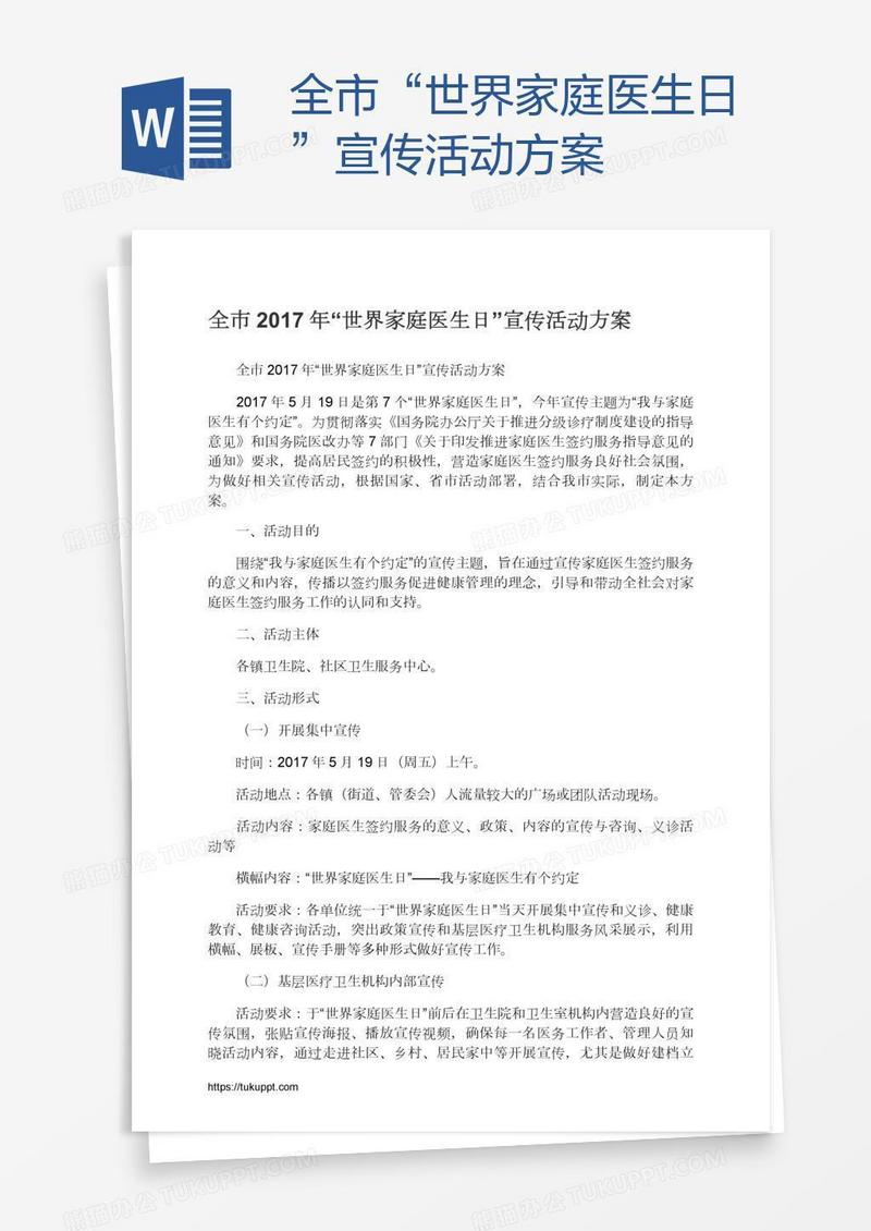 本作品为全市“世界家庭医生日”宣传活动方案, 编号:61874r0389, 格式为 docx, 大小1 MB, 本作品下载后,先解压,解压之后用推荐软件 Word(2010) 打开, 然后进行编辑功能。