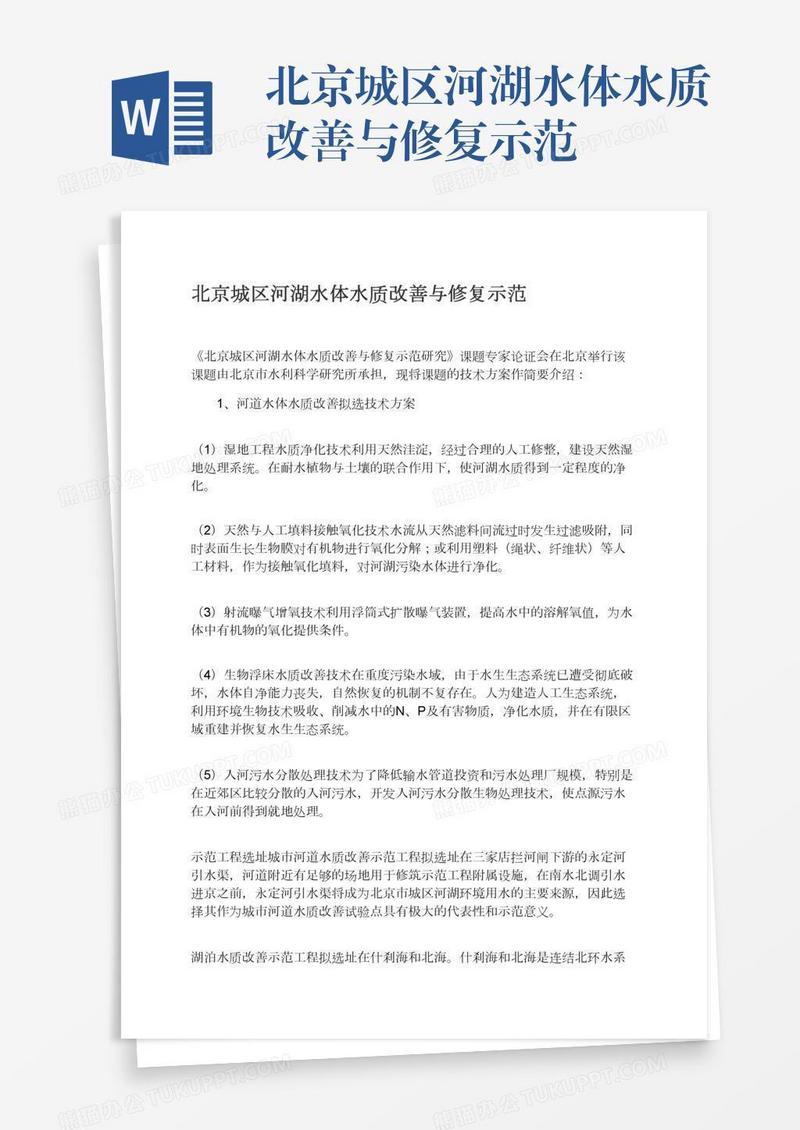 本作品为北京城区河湖水体水质改善与修复示范, 编号:6187j4p889, 格式为 docx, 大小1 MB, 本作品下载后,先解压,解压之后用推荐软件 Word(2010) 打开, 然后进行编辑功能。