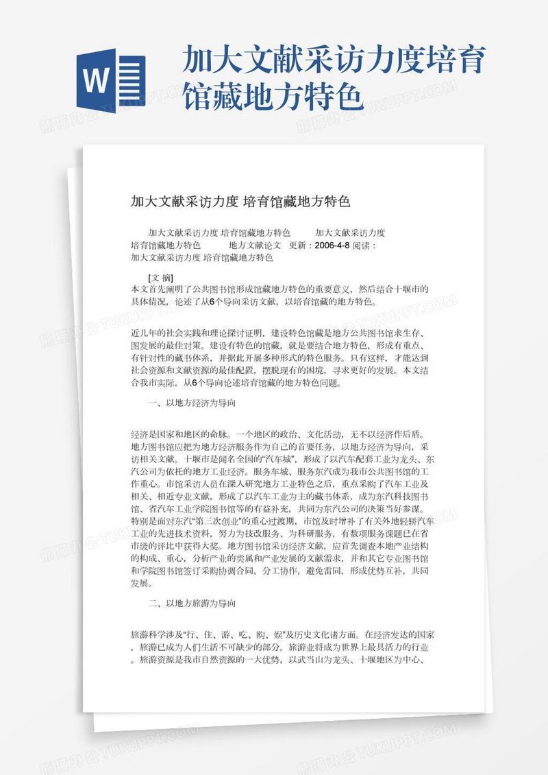 本作品为加大文献采访力度培育馆藏地方特色, 编号:6187j7v789, 格式为 docx, 大小1 MB, 本作品下载后,先解压,解压之后用推荐软件 Word(2010) 打开, 然后进行编辑功能。