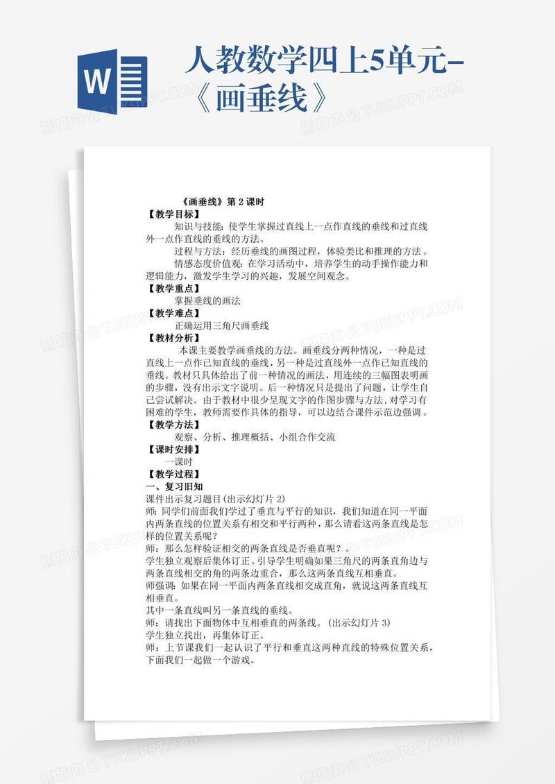本作品为人教数学四上5单元-《画垂线》, 编号:6187jbdl69, 格式为 docx, 大小1 MB, 本作品下载后,先解压,解压之后用推荐软件 Word(2010) 打开, 然后进行编辑功能。