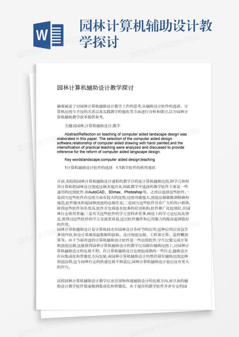 本作品为园林计算机辅助设计教学探讨, 编号:6187jn4n59, 格式为 docx, 大小1 MB, 本作品下载后,先解压,解压之后用推荐软件 Word(2010) 打开, 然后进行编辑功能。