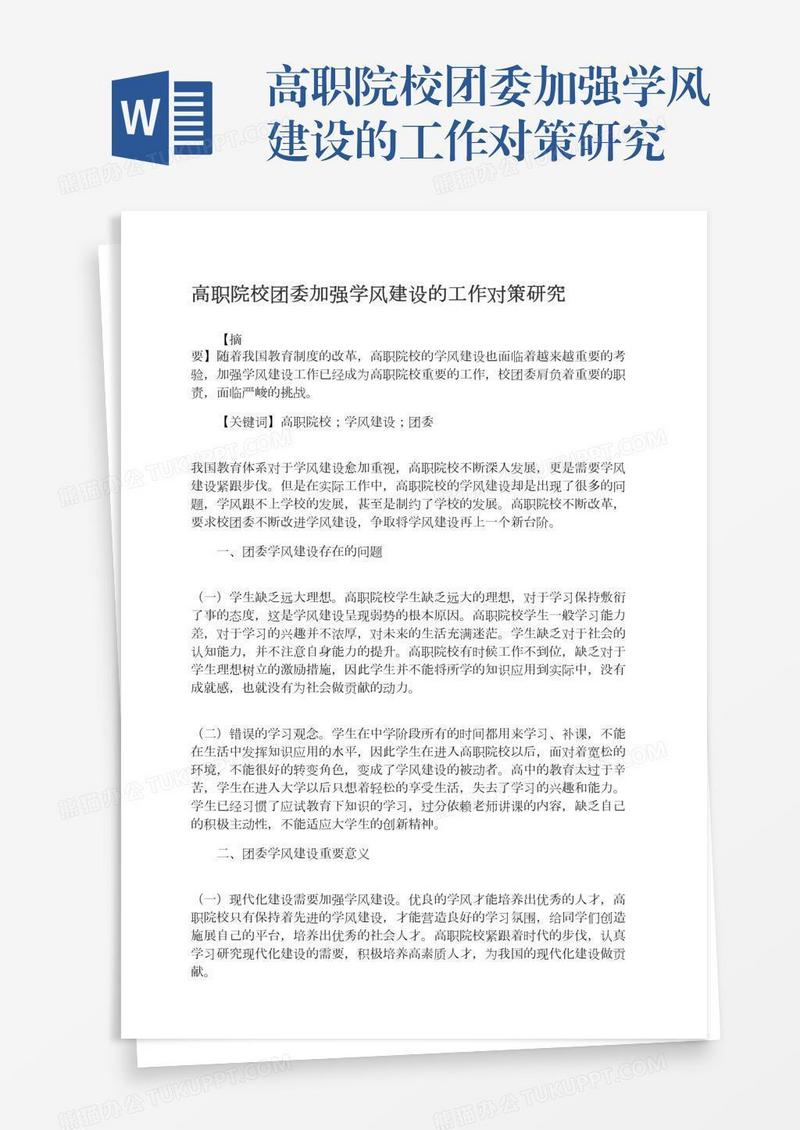本作品为高职院校团委加强学风建设的工作对策研究, 编号:6187jo4m89, 格式为 docx, 大小1 MB, 本作品下载后,先解压,解压之后用推荐软件 Word(2010) 打开, 然后进行编辑功能。
