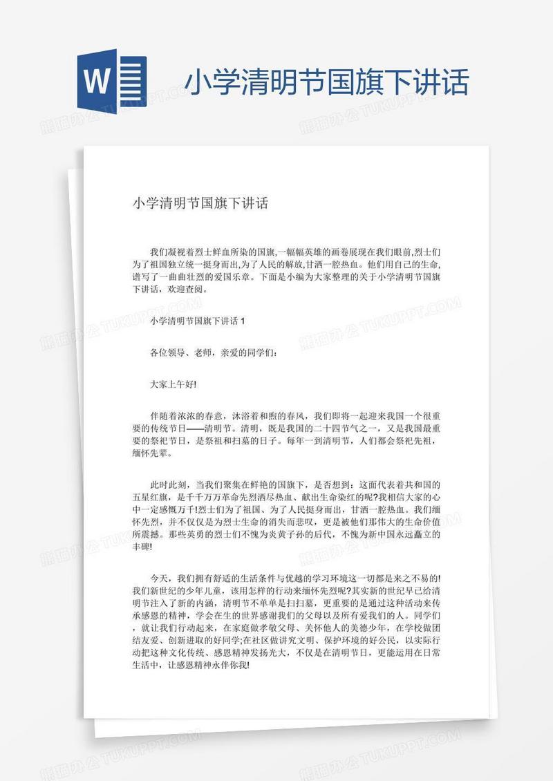 本作品为小学清明节国旗下讲话, 编号:6187r3b8y9, 格式为 docx, 大小1 MB, 本作品下载后,先解压,解压之后用推荐软件 Word(2010) 打开, 然后进行编辑功能。