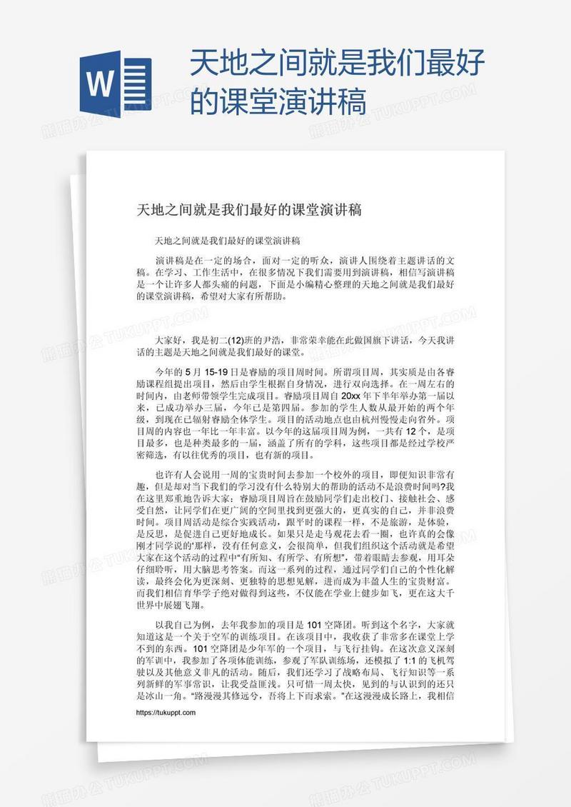 本作品为天地之间就是我们最好的课堂演讲稿, 编号:6187rdq559, 格式为 docx, 大小1 MB, 本作品下载后,先解压,解压之后用推荐软件 Word(2010) 打开, 然后进行编辑功能。