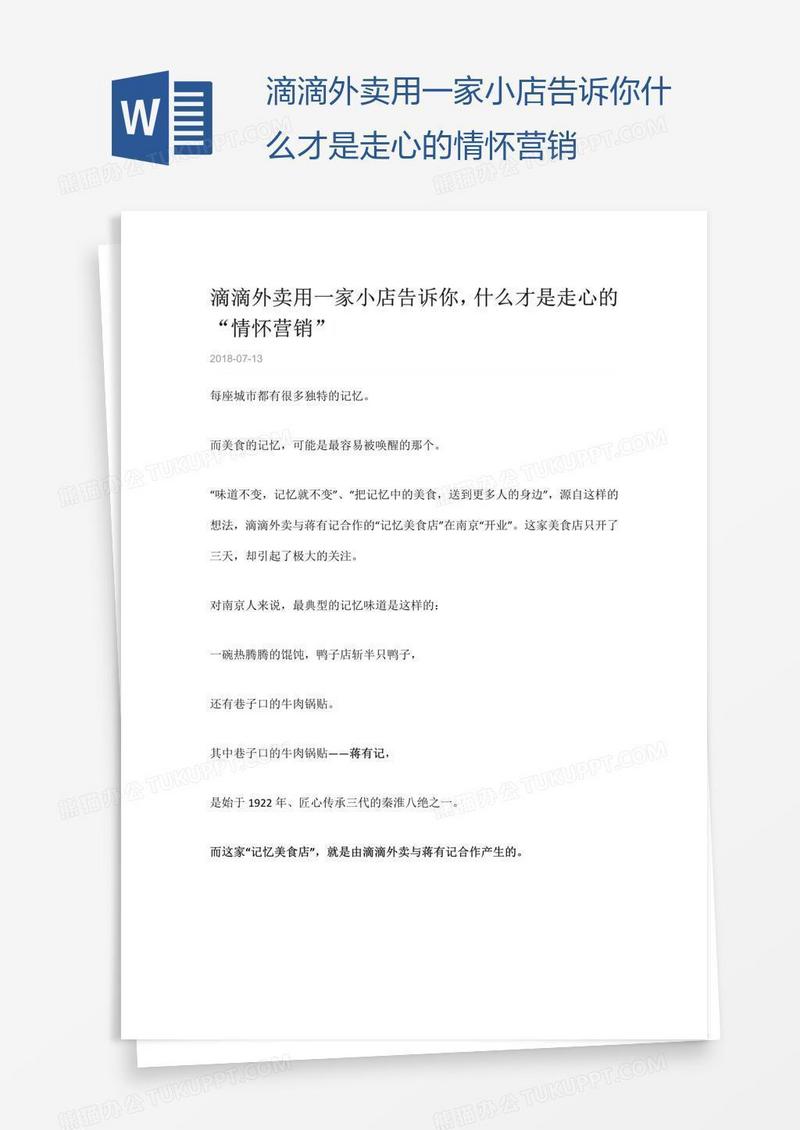 本作品为滴滴外卖用一家小店告诉你什么才是走心的情怀营销, 编号:6187rw64j9, 格式为 docx, 大小3 MB, 本作品下载后,先解压,解压之后用推荐软件 Word(2010) 打开, 然后进行编辑功能。