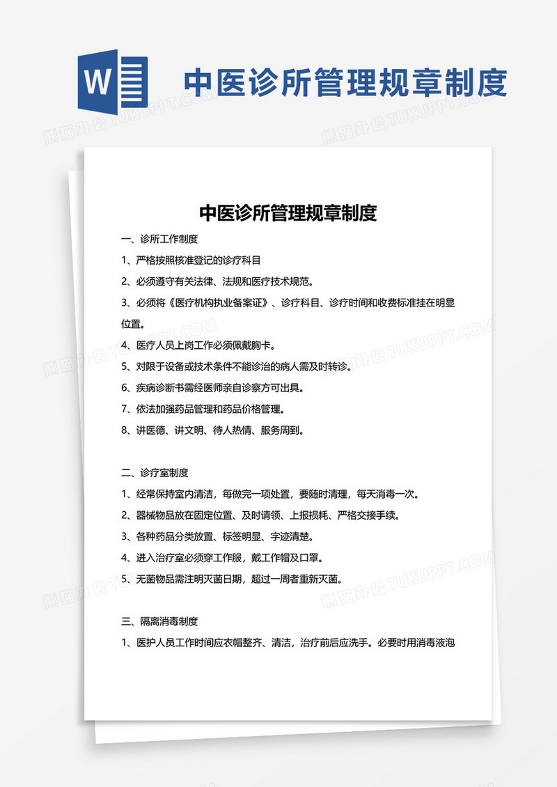 本作品为中医诊所管理规章制度word模板, 编号:71md277pp1, 格式为 docx, 大小1 MB, 本作品下载后,先解压,解压之后用推荐软件 Word(2019) 打开, 然后进行编辑功能。