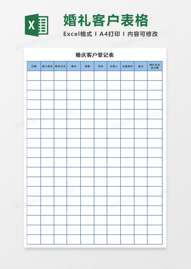 本作品为婚庆客户登记表excel模板, 编号:71md2kwov1, 格式为 xlsx, 大小1 MB, 本作品下载后,先解压,解压之后用推荐软件 Excel(2016) 打开, 然后进行编辑功能。