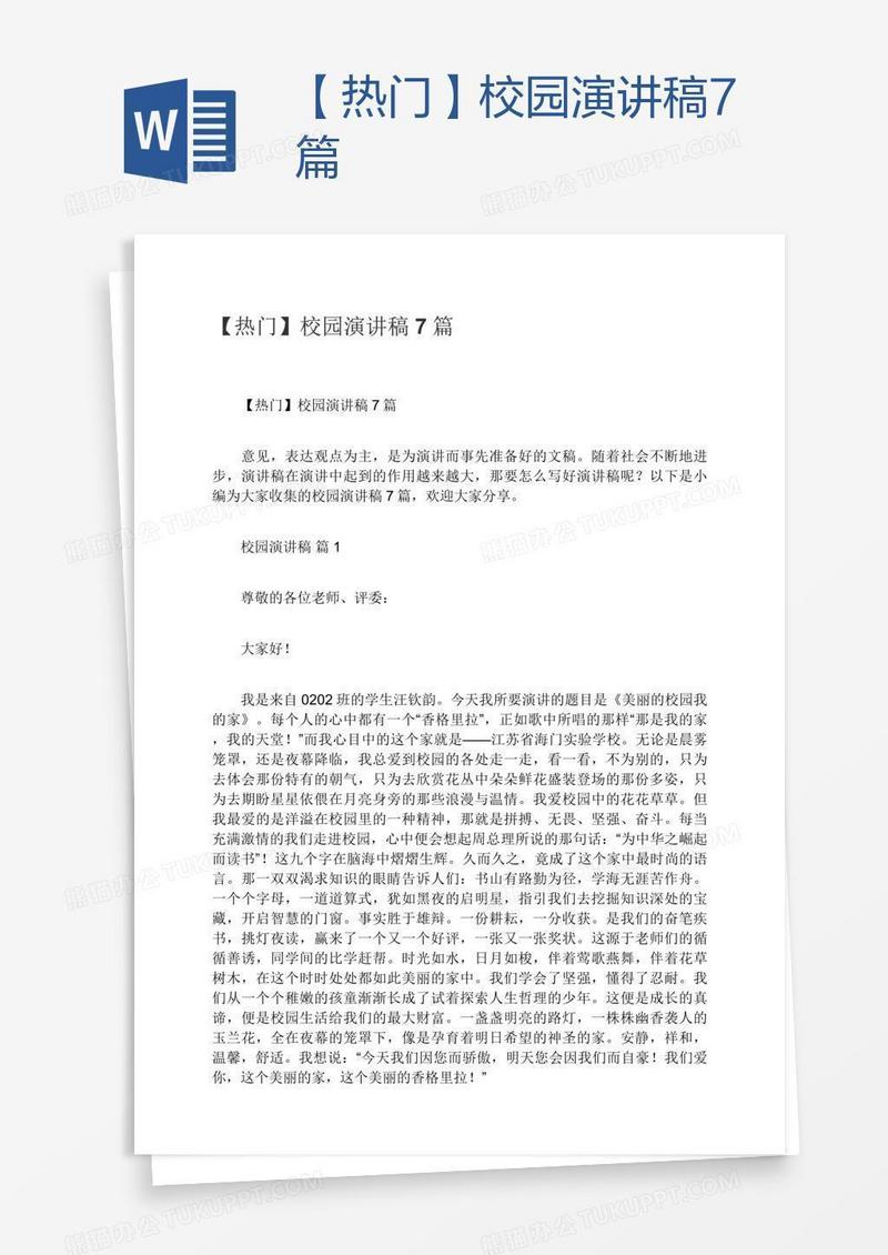 本作品为【热门】校园演讲稿7篇, 编号:71md2p22p1, 格式为 docx, 大小1 MB, 本作品下载后,先解压,解压之后用推荐软件 Word(2010) 打开, 然后进行编辑功能。