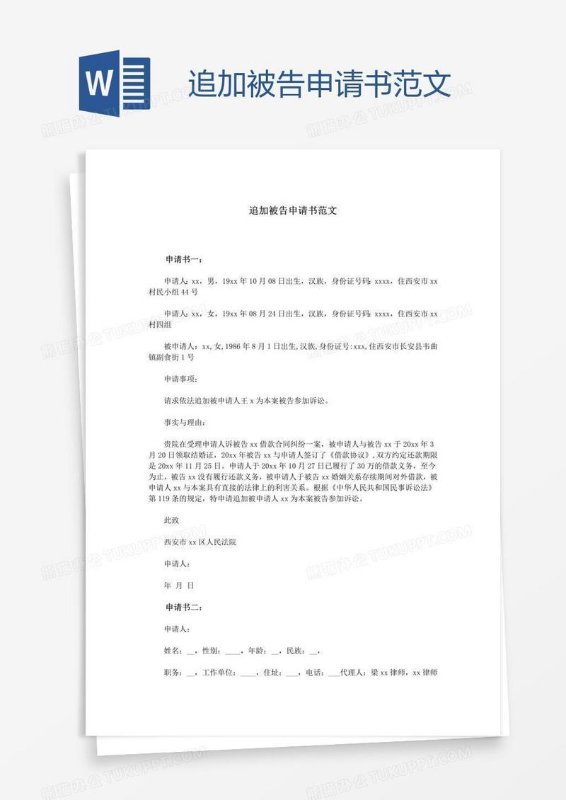 本作品为追加被告申请书范文, 编号:71md2q8bd1, 格式为 docx, 大小1 MB, 本作品下载后,先解压,解压之后用推荐软件 Word(2010) 打开, 然后进行编辑功能。