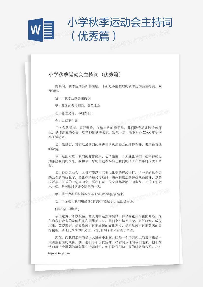本作品为小学秋季运动会主持词(优秀篇), 编号:71mdm0dop1, 格式为 docx, 大小1 MB, 本作品下载后,先解压,解压之后用推荐软件 Word(2010) 打开, 然后进行编辑功能。