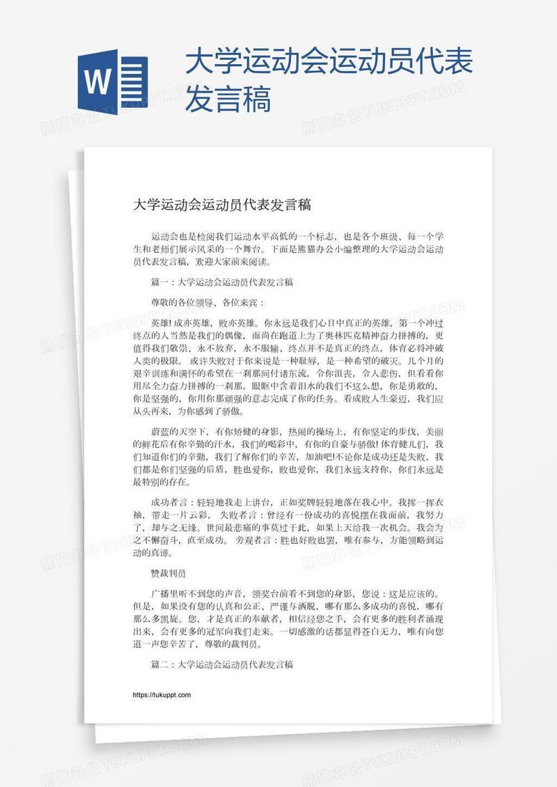 本作品为大学运动会运动员代表发言稿, 编号:71mdm0kwo1, 格式为 docx, 大小1 MB, 本作品下载后,先解压,解压之后用推荐软件 Word(2010) 打开, 然后进行编辑功能。