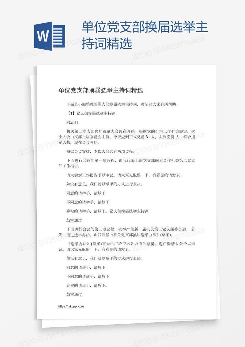 本作品为单位党支部换届选举主持词精选, 编号:71mdm0rvp1, 格式为 docx, 大小1 MB, 本作品下载后,先解压,解压之后用推荐软件 Word(2010) 打开, 然后进行编辑功能。